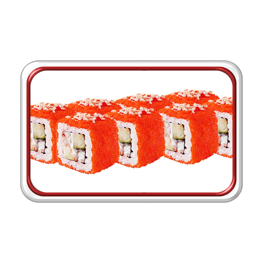 Копченый угорь, майонез, кунжут, икра Тобико, рис.