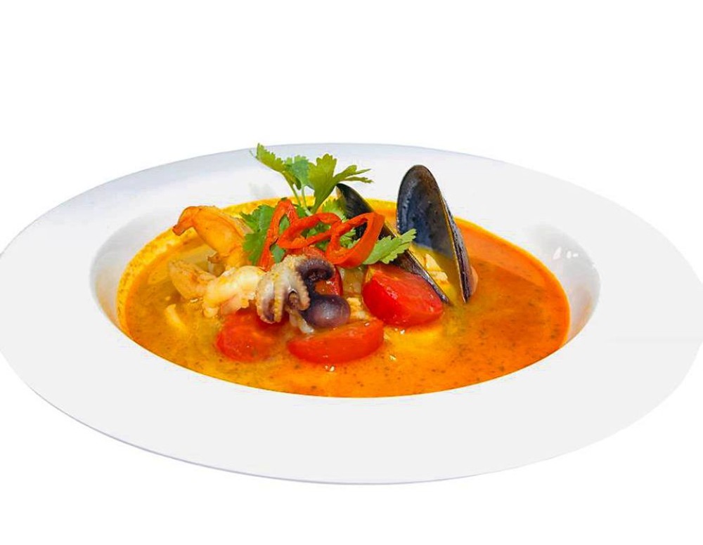 Легендарный Тайский суп с кокосовым молоком, морепродуктами и пряными специями.