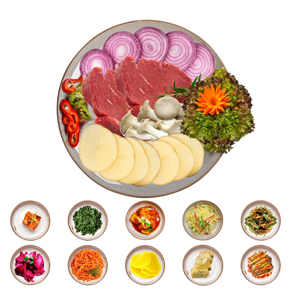 Beef BBQ. Serves with set of salads and lettuce. Подаётся с панчаном и листьями салата.