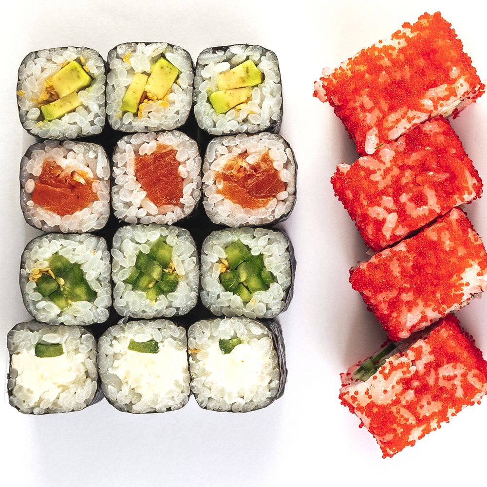 Ролл с авокадо - 3 шт. Ролл с лососем - 3 шт. Ролл с огурцом - 3 шт. Ролл Чиз - 3шт. Ролл Калифорния классик - 4 шт.