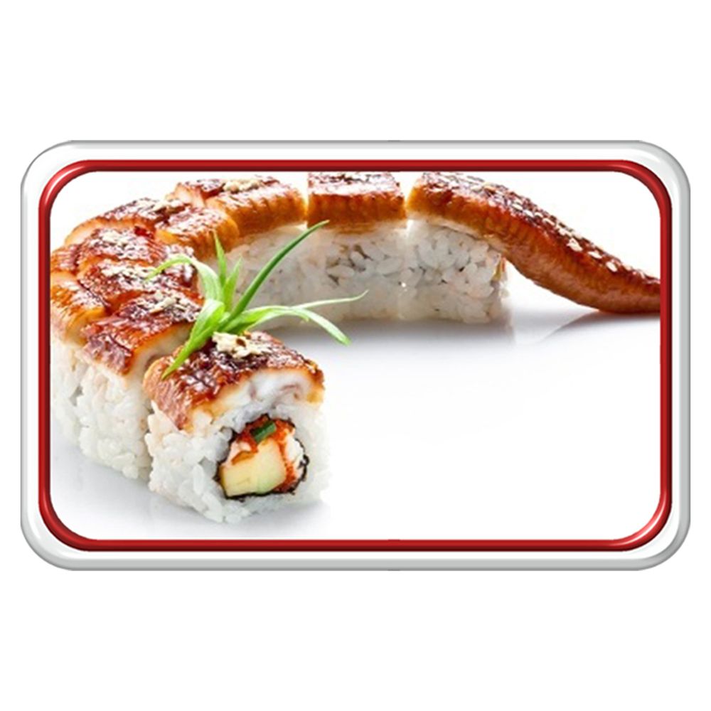 Копченый угорь, сливочный сыр, омлет, огурцы, зеленый лук, икра Тобико, кляр, рис.